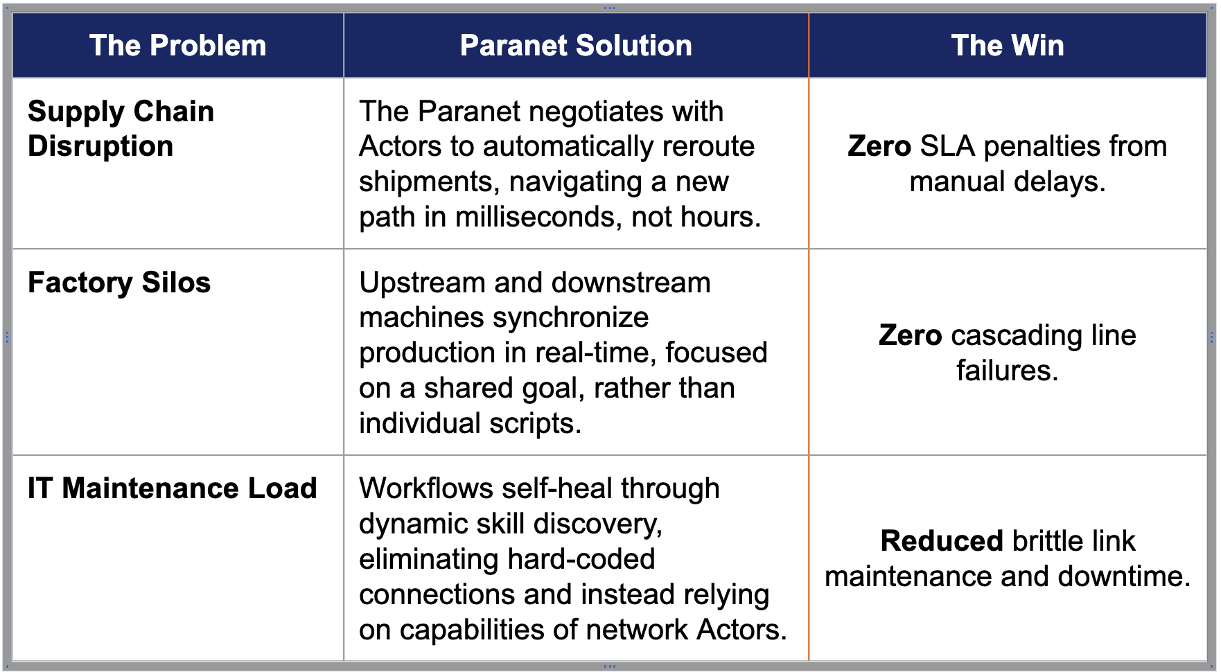 Traditional automation is a "house of cards"—one broken API or delayed shipment crashes the system. The Paranet is different. We turn your assets (sensors, bots, software) into intelligent Actors. Instead of following a rigid script, Actors use Goal Tree Logic to negotiate, collaborate, and find a new path to the goal autonomously.